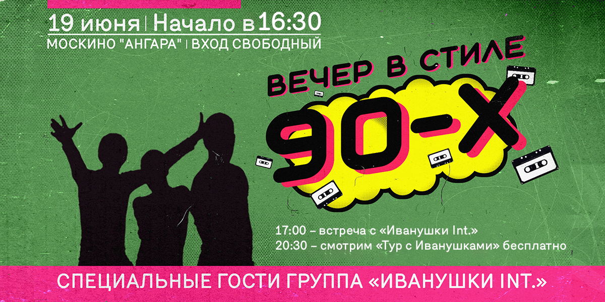 ДЛЯ ПРОХОДА НА ВЕЧЕР В СТИЛЕ 90-Х И ВСТРЕЧУ С ГРУППОЙ «ИВАНУШКИ INTERNATIONAL» РЕГИСТРАЦИЯ НЕ НУЖНА, ВХОД СВОБОДНЫЙ. НАЧАЛО МЕРОПРИЯТИЯ В 16:30 НА КРЫШЕ РАЙОННОГО ЦЕНТРА «МЕСТО ВСТРЕЧИ АНГАРА».